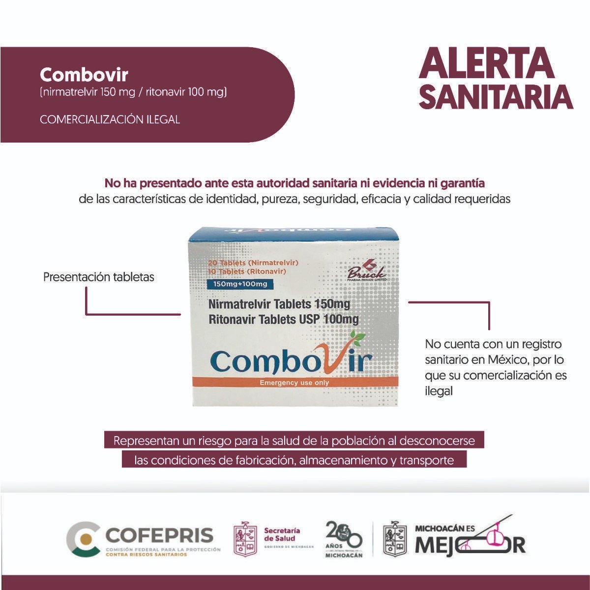 Morelia, Michoacán, 30 de octubre de 2024.- La Secretaría de Salud de Michoacán (SSM), a través de la Comisión Estatal para la Protección contra Riesgos Sanitarios (Coepris), alerta a la población sobre la venta irregular del medicamento Combovir (nirmatrelvir 150 mg/ritonavir 100 mg), en presentación tabletas, ya que no cuenta con registro sanitario para su venta en México y que promete tratar el COVID-19.