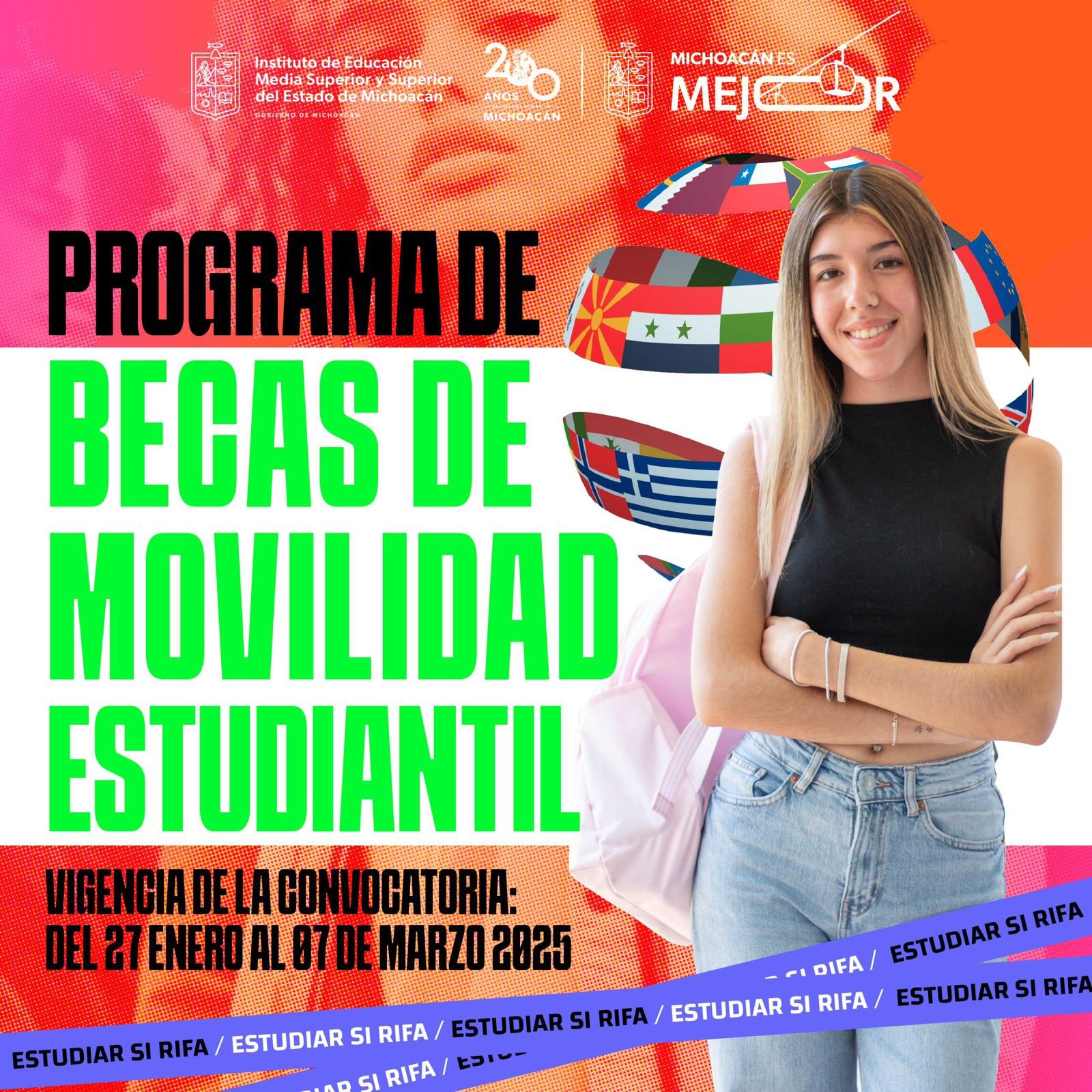 Morelia, Michoacán, 23 de diciembre de 2024.- Del 27 de enero al 7 de marzo de 2025, el Instituto de Educación Media Superior y Superior del Estado de Michoacán (Iemsysem) abrirá la primera convocatoria del Programa de Becas de Movilidad Estudiantil, el cual, en este 2024 ha beneficiado a 885 estudiantes michoacanos.