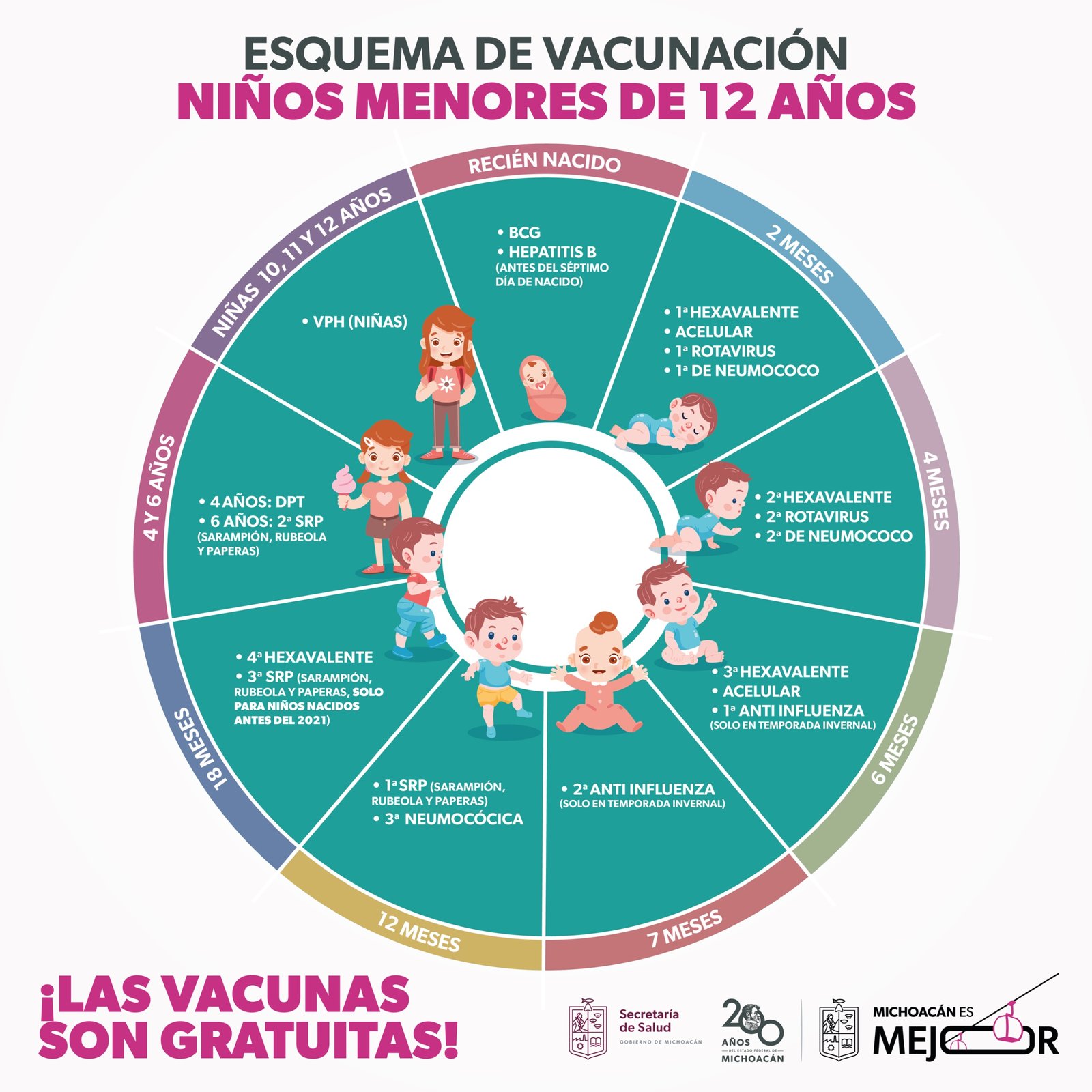 También se aplican dosis contra el rotavirus para bebés de dos y cuatro meses, neumococo para menores de un año y adultos mayores de 60, así como contra la influenza y COVID-19 para personas de cinco años en adelante.
