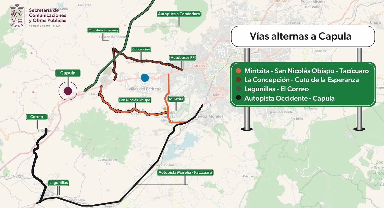 Morelia, Michoacán, 15 de octubre de 2024.- La Secretaría de Comunicaciones y Obras Públicas (SCOP) da a conocer a turistas y visitantes las rutas alternas para llegar a la tenencia de Capula, donde, del 20 de octubre al 3 de noviembre, se desarrollará la 14 Feria Nacional y Cultural de la Catrina.