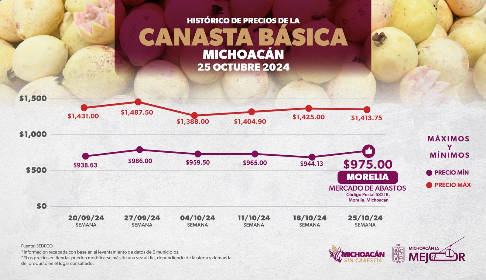 En tanto, el costo más bajo para Uruapan fue en Aurrera con mil 241 pesos y el más alto en Morelia en el mercado San Juan con mil 234 pesos.