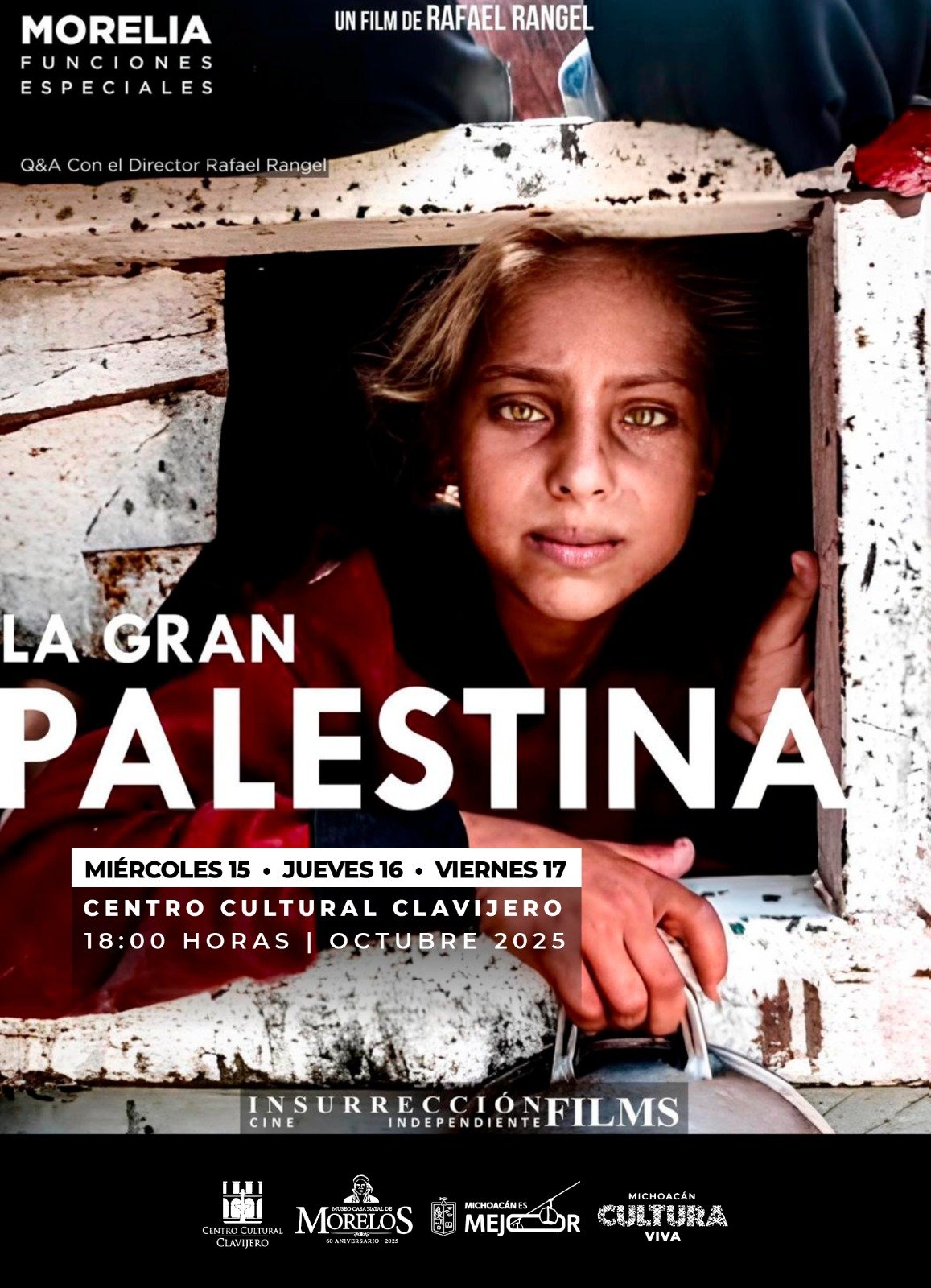 Morelia, Michoacán, 14 de octubre de 2025.- La Secretaría de Cultura de Michoacán (Secum) invita a las proyecciones del documental “La gran Palestina”, del director Rafael Rangel, que se realizarán los días 15, 16 y 17 de octubre a las 18:00 horas en el Auditorio del Centro Cultural Clavijero, con entrada libre. La obra forma parte de la línea de cine vivencial del realizador y continúa la investigación iniciada con la cinta “Gaza: La franja del exterminio”.