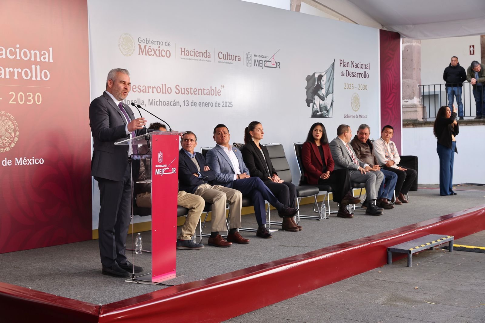 Morelia, Michoacán, 13 de enero de 2025.- Con el compromiso de apoyar las políticas públicas en materia ambiental impulsadas por la presidenta Claudia Sheinbaum Pardo, el gobernador Alfredo Ramírez Bedolla dio arranque a los trabajos del Foro de Sustentabilidad para el Plan Nacional de Desarrollo 2025-2030, en el cual se abordan temáticas que permitirán delinear acciones en la materia.