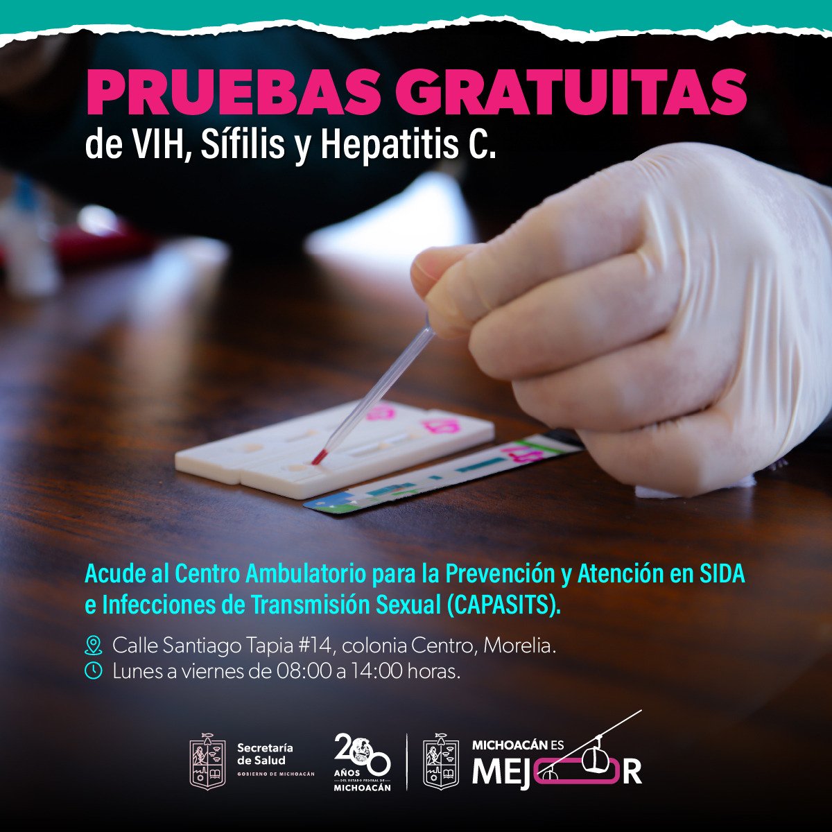 Morelia, Michoacán, 14 de enero de 2025.- Durante el mes de enero la Secretaría de Salud de Michoacán (SSM) realizará sin costo pruebas rápidas para detectar VIH o SIDA en sus centros de salud.