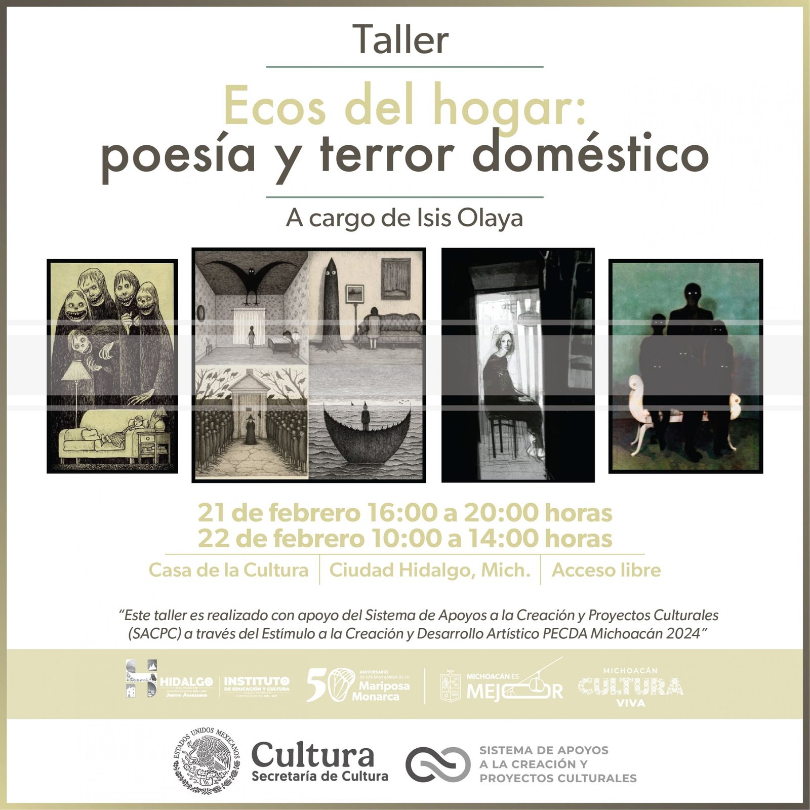 Morelia, Michoacán, 16 de febrero del 2025.- Si te interesa la escritura creativa y quieres explorar el terror doméstico desde una perspectiva literaria, la Secretaría de Cultura de Michoacán te invita al taller “Ecos del hogar: poesía y terror doméstico”. Se llevará a cabo en la Casa de la Cultura del municipio de Hidalgo, el 21 de febrero de 16:00 a 20:00 horas y el 22 de febrero de 10:00 a 14:00 horas.