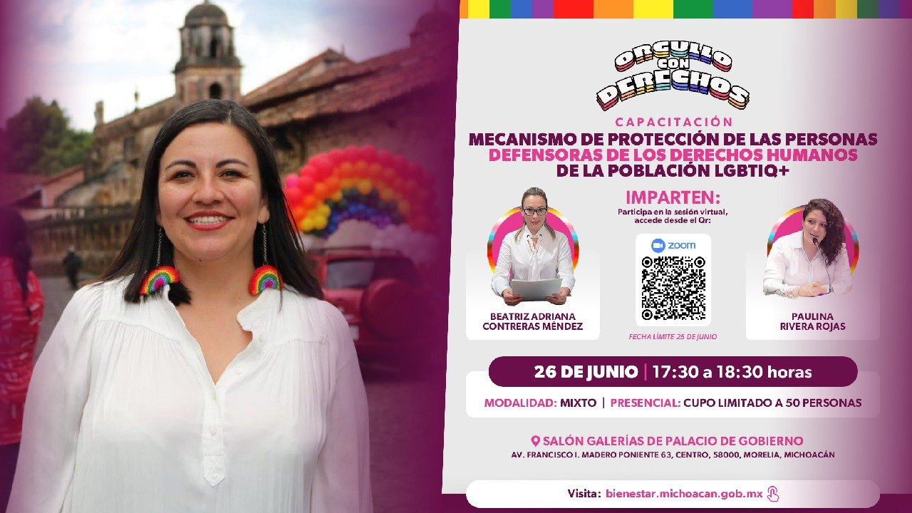 Morelia, Michoacán, 24 de junio de 2025.- En continuidad a las actividades conmemorativas del Mes del Orgullo, y bajo el eslogan “Orgullo con Derechos”, la Secretaría del Bienestar (Sedebi) llevará a cabo el taller de capacitación sobre mecanismos de protección a personas defensoras de derechos humanos de la población LGBTTTIQ+.