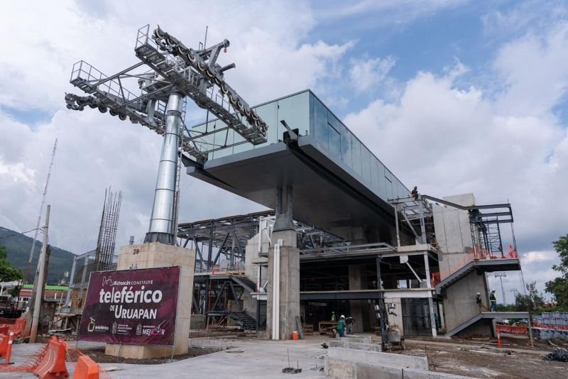 Uruapan, Morelia, 11 de octubre de 2025.- El teleférico de Uruapan avanza a paso firme con un progreso del 92.39 por ciento, que se ve reflejado en la obra civil y adecuación electromecánica de las seis estaciones que conforman este nuevo medio de transporte, informó la secretaria de Desarrollo Urbano y Movilidad, Gladyz Butanda Macías.