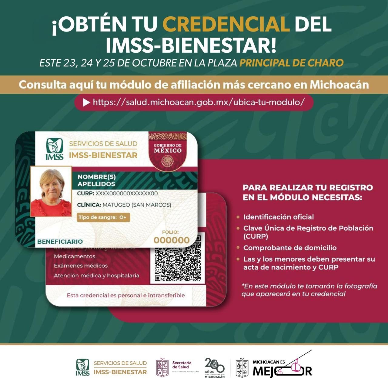 Con la credencial del IMSS Bienestar la población beneficiada podrá solicitar servicios gratuitos como consulta médica, análisis de laboratorio, cirugías, vacunación, entre otros más, en los 364 centros de salud y 27 hospitales del IMSS Bienestar en Michoacán.